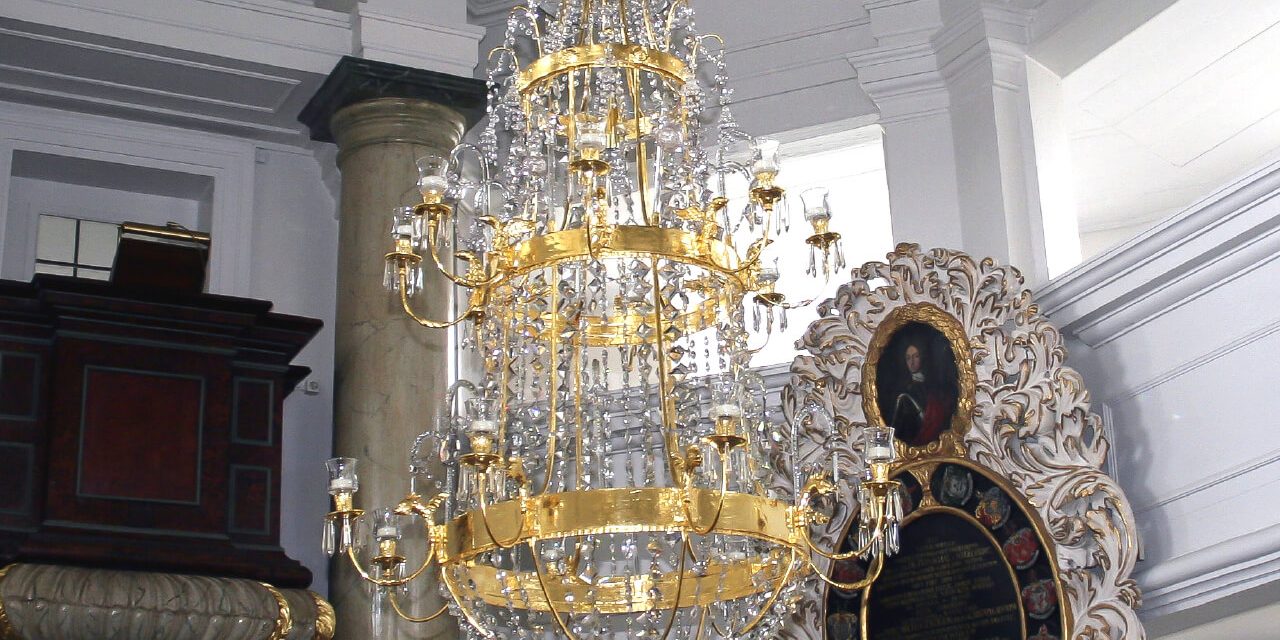 8 Kirchengemeind Hehlen-Leuchter ca.1800Polimentvergoldung mit Blattgoldkomplett restauriert. Der Leuchter war sehr stark geschädigt braun lasiert Glasbehang 19.Jahrhunder